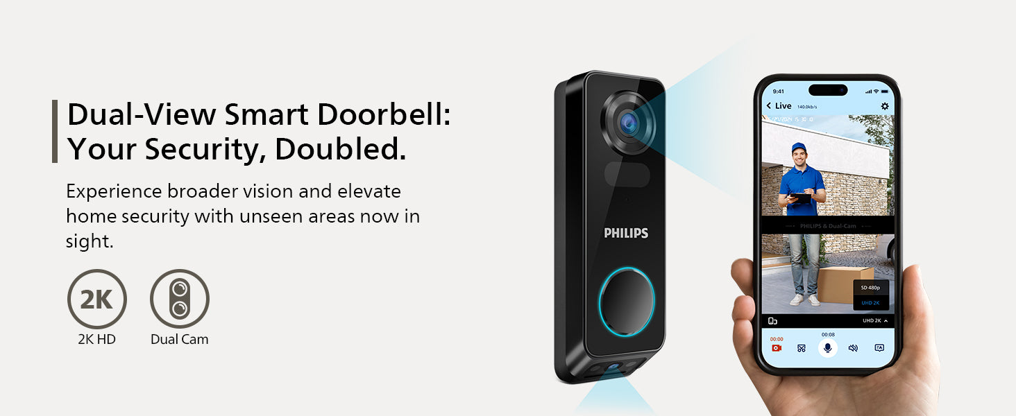 Elevate your home security with the Philips Video Doorbell. Whether you’re home or away, get real-time alerts, speak with visitors, and monitor every detail with 2K HDR video and dual-view technology.